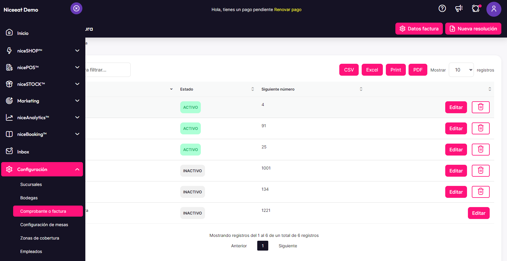 - Listo, la próxima factura o nota crédito que emitas ya tomará la resolución vigente y activa que tengas configurada en niceeat.