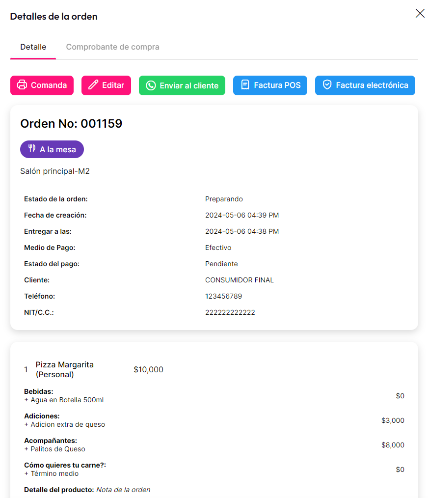 3. En la pestaña Detalle puedes ver el detalle de la orden, imprimir comanda, editar la orden, enviar la URL del pedido al cliente por WhatsApp web, Facturar la orden.